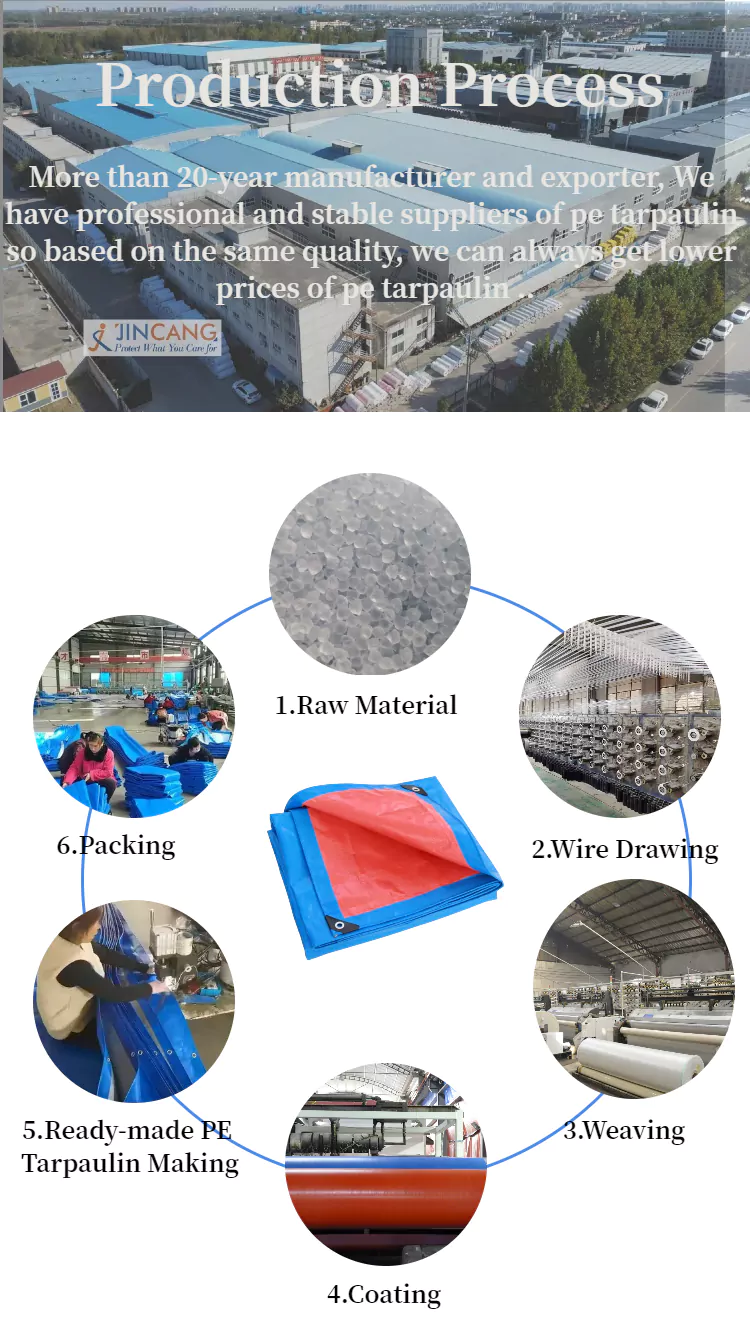 Jincang является одним из профессиональных производителей рулонов полиэтиленового брезента в Китае. Рулон полиэтиленового брезента 110 GSM сочетает в себе долговечность и видимость, сочетая водонепроницаемые свойства полиэтилена с хорошо заметными цветными полосами. Он широко используется для наружной защиты, покрытия товаров, строительных площадок, сельскохозяйственных целей и временных укрытий.