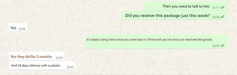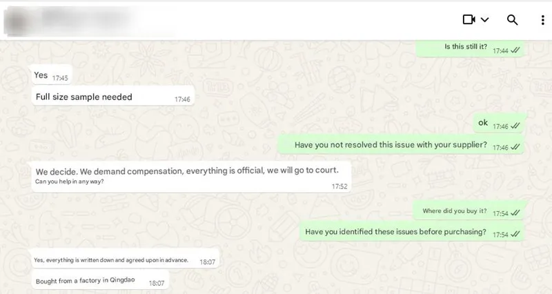Недавно мы узнали, что клиент столкнулся с серьезными проблемами при заказе брезента у конкурента. Их соблазнила низкая цена, и в конечном итоге фабрике потребовалось два месяца, чтобы завершить производство. При доставке они обнаружили, что товара нет в наличии и он не соответствует первоначально согласованному размеру. В настоящее время клиент рассматривает возможность судебного иска. Ниже приведена расшифровка моего общения с этим клиентом.